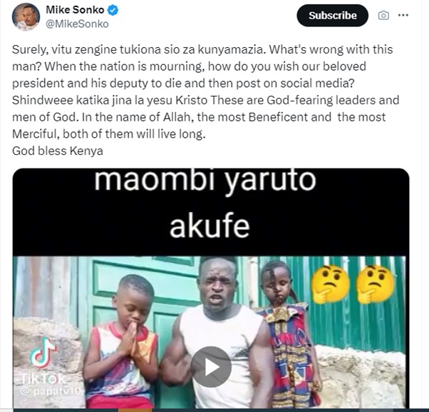 Friday, April 19, 2024 - Former Nairobi Governor, Mike Sonko, has called out a man who recorded a video praying for the deaths of President William Ruto and his deputy, Rigathi Gachagua.