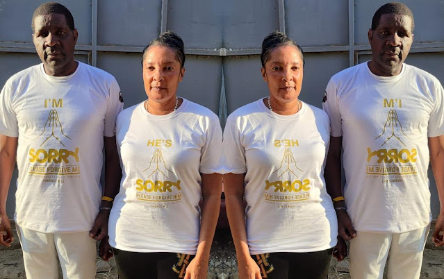 husband and wore a similar t-shirt that read; “He is sorry, Please forgive