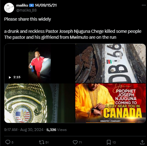 Friday, August 30, 2024 - Pastor Joseph Njuguna of Shekinah Glory Tabernacle Church caused a fatal accident while driving under the influence of alcohol at night.